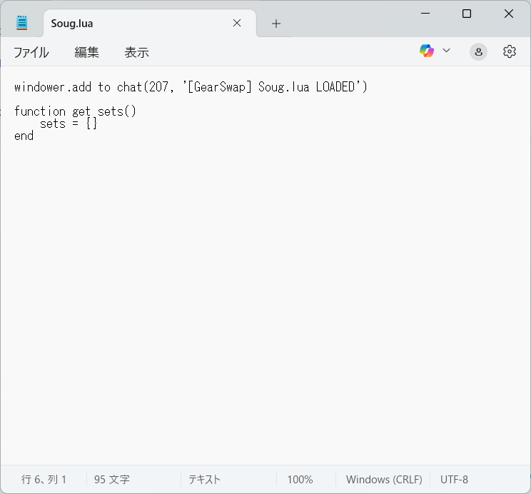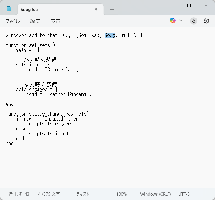 [GearSwap] Soug.lua LOADEDが表示される※Sougの部分は自分のキャラ名