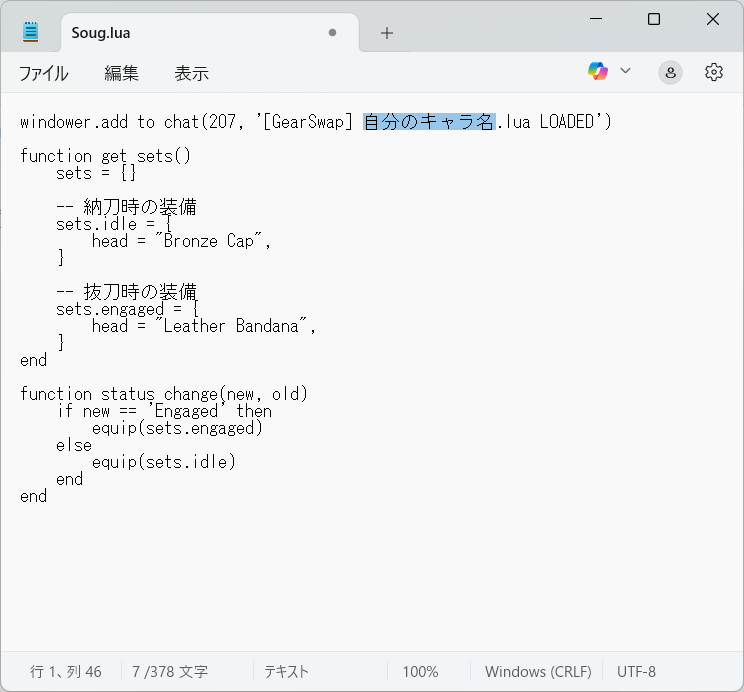 前の記事で作成した自分のキャラ名.lua を メモ帳で開きます。